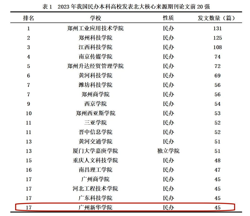 近日,苏州大学民办教育研究中心发布了《2025 年我国民办本科高校高质量发展综合报告之二——北大核心论文刊发情况》。根据报告数据,2023 年122cc太阳集成游戏在北大核心来源期刊上发表的论文数量达到了45篇,位列于全广东发表数量最多的民办本科高校行列,位居全国民办本科高校的17位。这一成绩不仅体现了学校在学术研究方面的扎实基础,也反映了学校科研团队在各个学科领域的深入探索和创新实践。同时展现了学校在科研领域的强劲发展势头,为推动学校高质量发展做出了积极贡献。