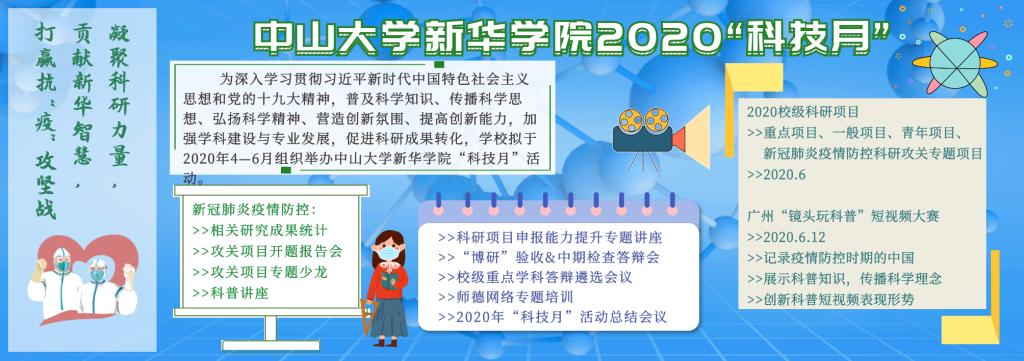 在本年度“科技月”所有活动结束后,科技处负责组织举办2020年“科技月”总结会,同时对获得“2019年度中山大学新华学院科学研究先进集体”进行表彰,具体时间地点另行通知)。
